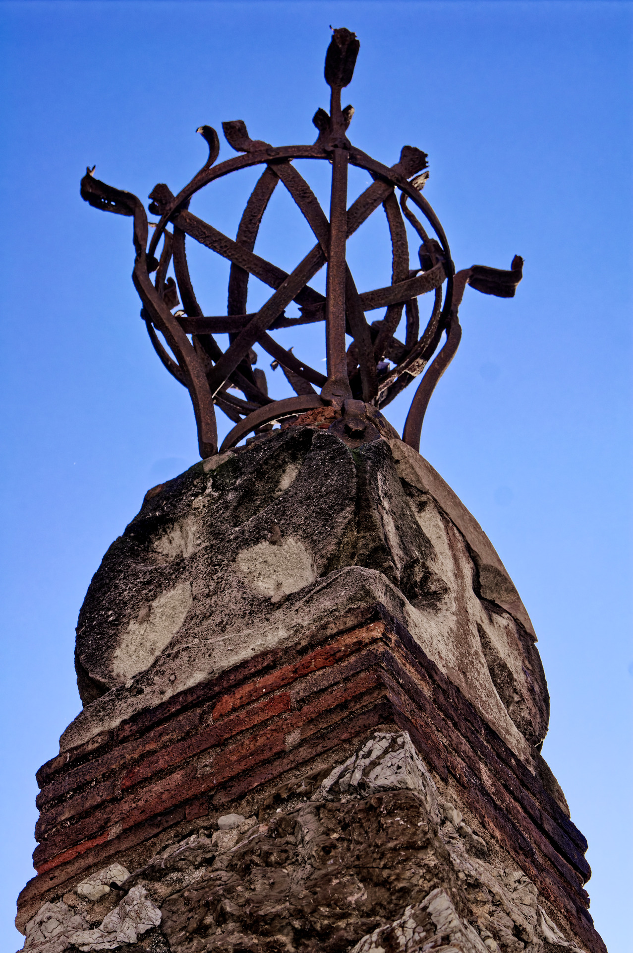 The image captures a close-up view of an ornate, historical structure. The base is constructed from weathered stone bricks, creating a sturdy and aged foundation. Rising from this base is a complex metal framework, resembling an armillary sphere, a type of astronomical instrument. The metal is dark and textured, suggesting exposure to the elements over time.