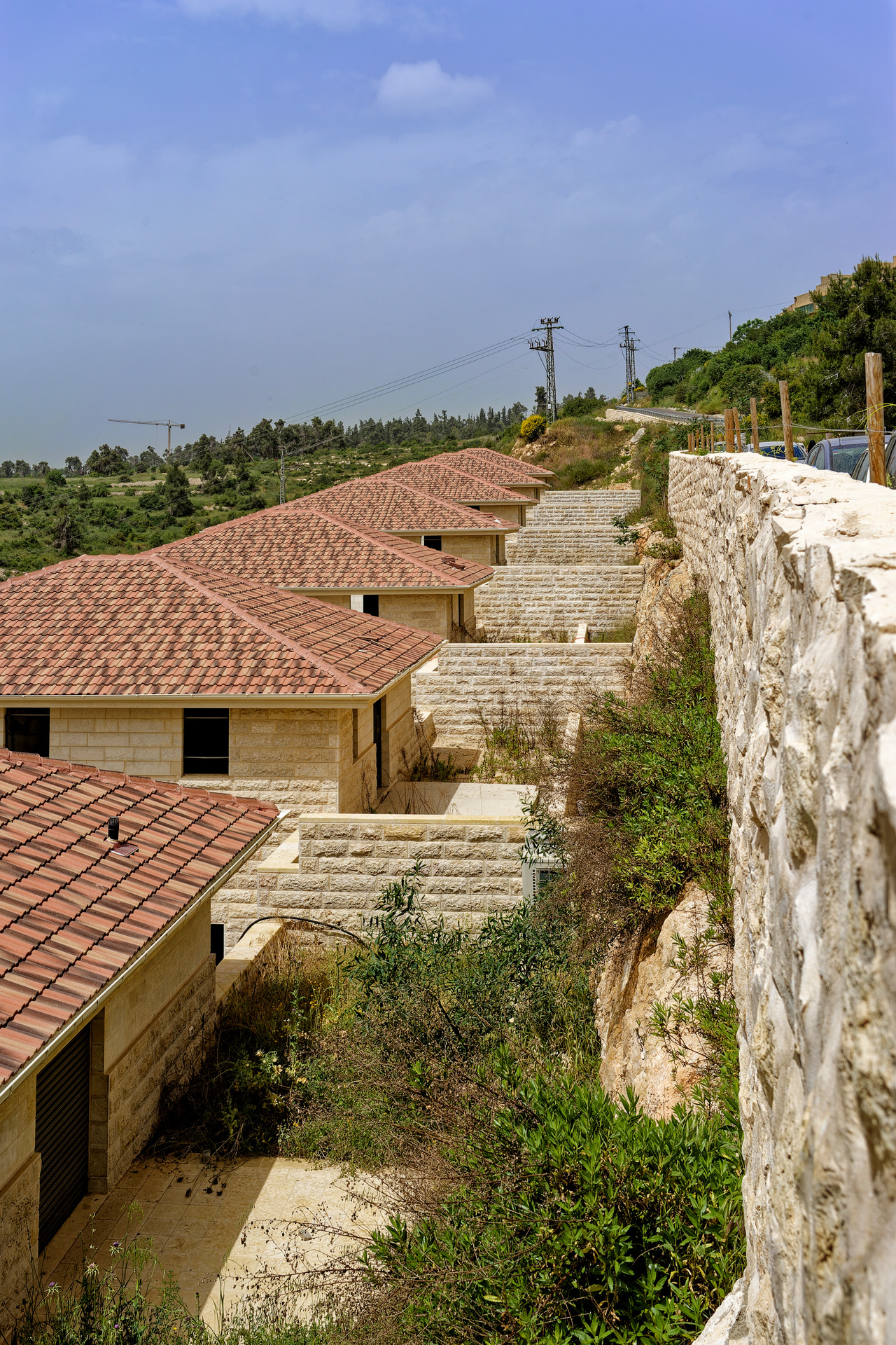 The buildings are constructed primarily of light-colored stone and stucco, which further enhances their connection to the natural environment. The design emphasizes simplicity and practicality, with minimal detailing and a focus on maximizing natural light and ventilation. The hillside location provides stunning views of the surrounding valley, creating a tranquil and secluded setting.
