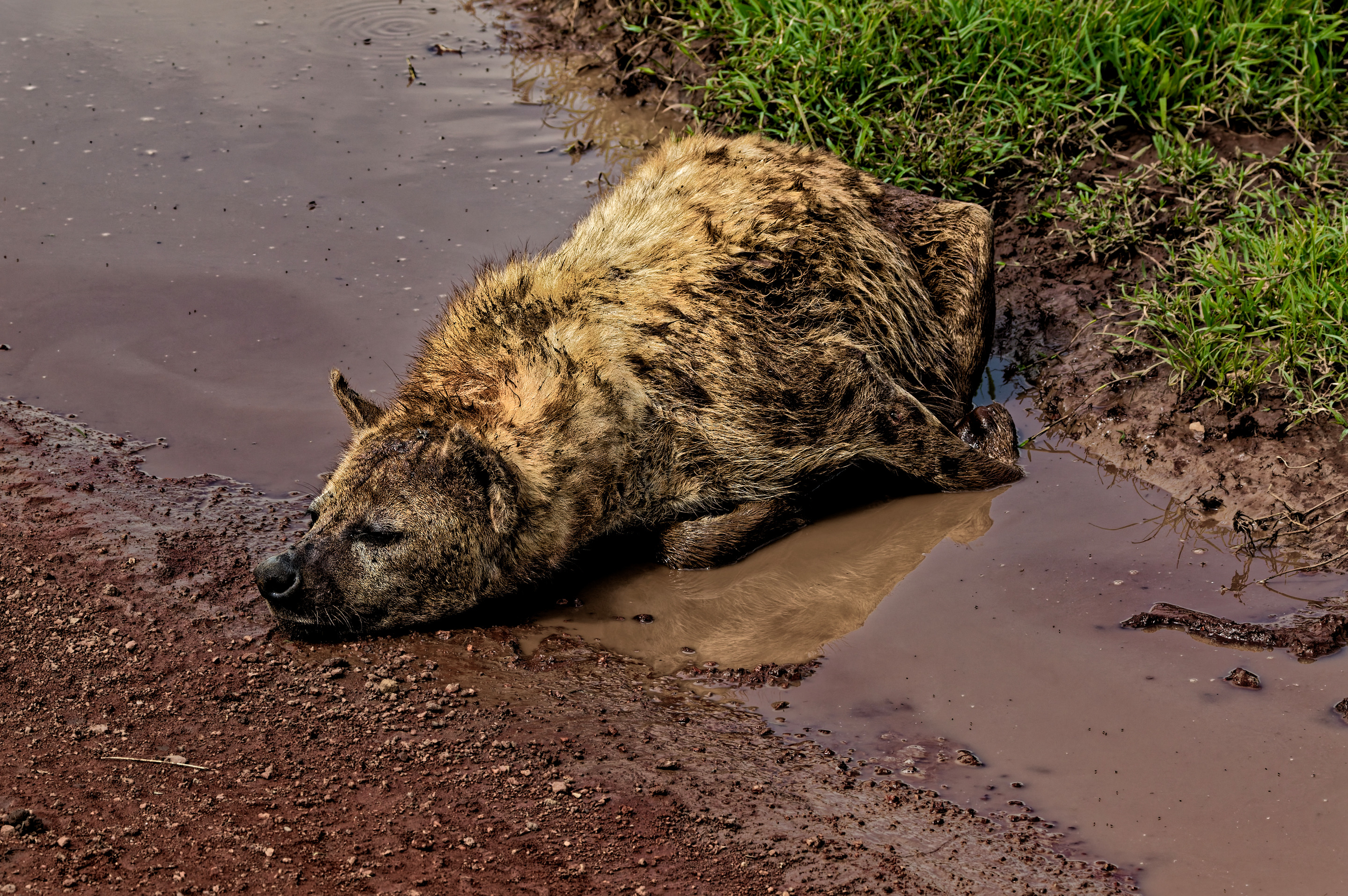 A spotted hyena rests comfortably in a muddy puddle, surrounded by a patch of vibrant green grass. The animal?s coat appears thick and textured, with a prominent neck and rounded ears. Its dark muzzle is nestled in the wet mud, and the body is partially coated with mud, suggesting it?s seeking relief from the heat.