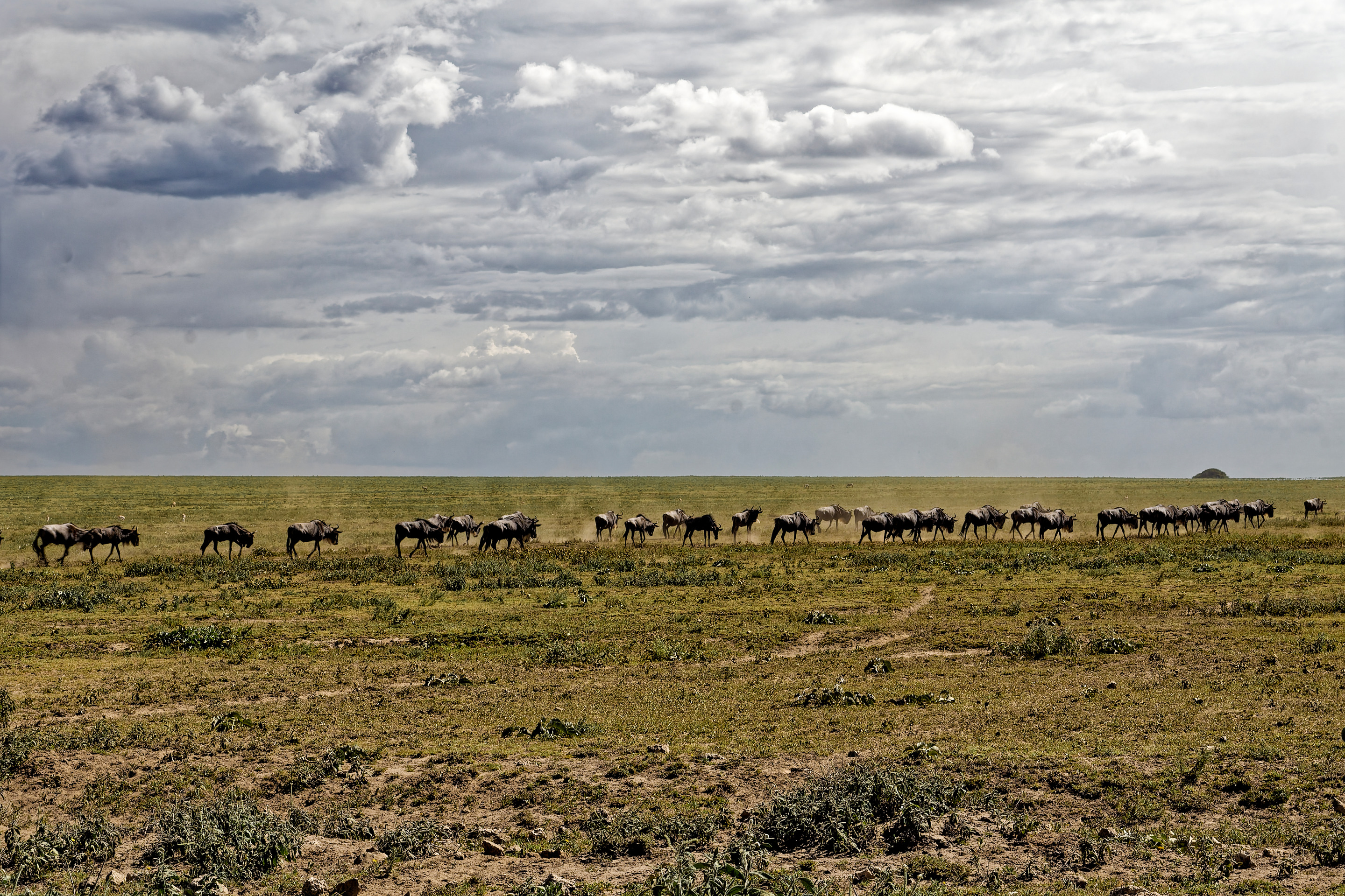 A long line of wildebeest walks across a wide, flat grassland under a big, cloudy sky. The open plain feels vast, with low green patches and dry ground stretching to the horizon.