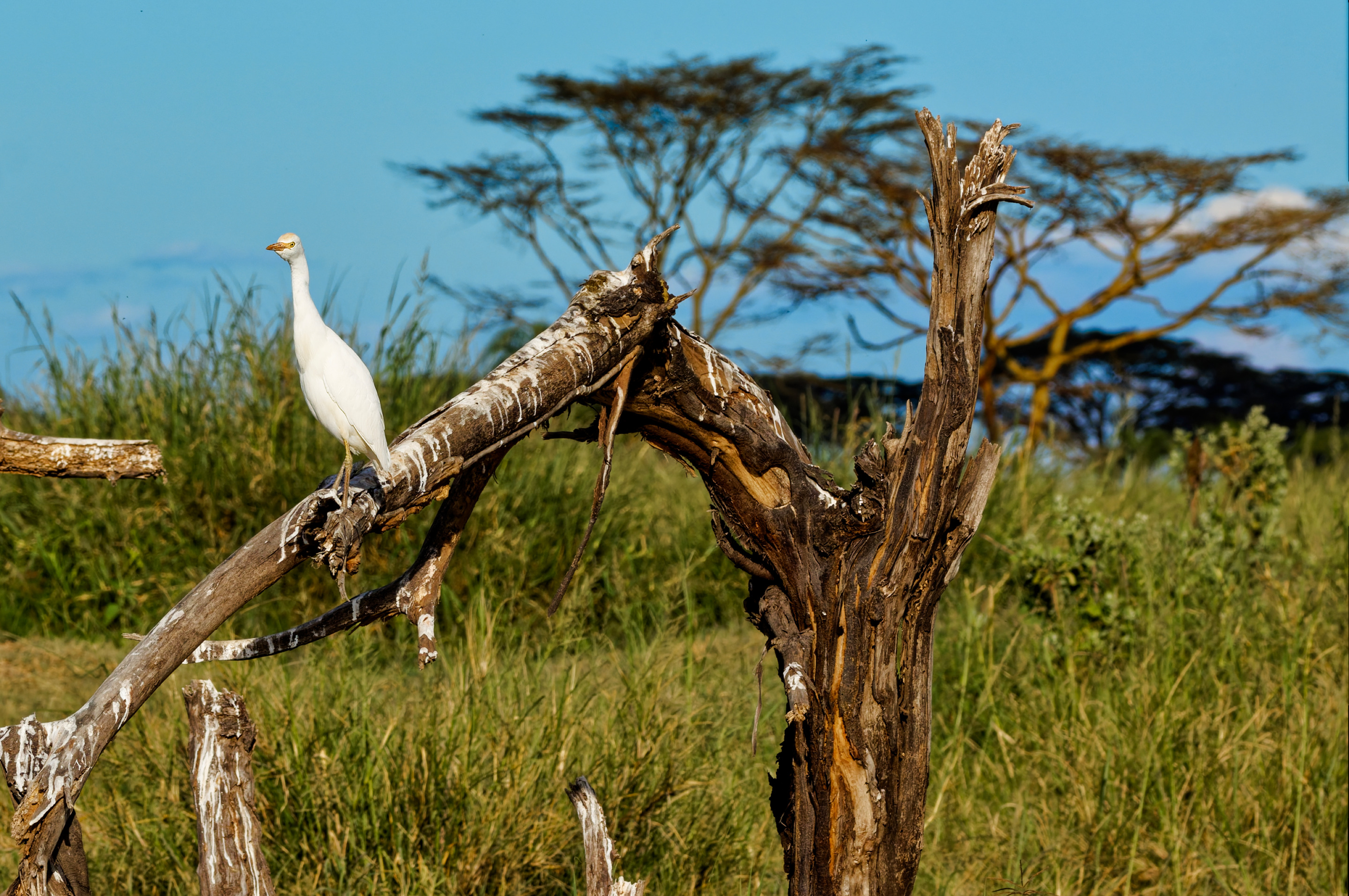 A cattle egret perches on a dead tree branch above tall green grass, with a flat-topped acacia tree in the distance under a clear blue sky. The bird has white feathers, a slim body, a long neck, and a yellow bill.