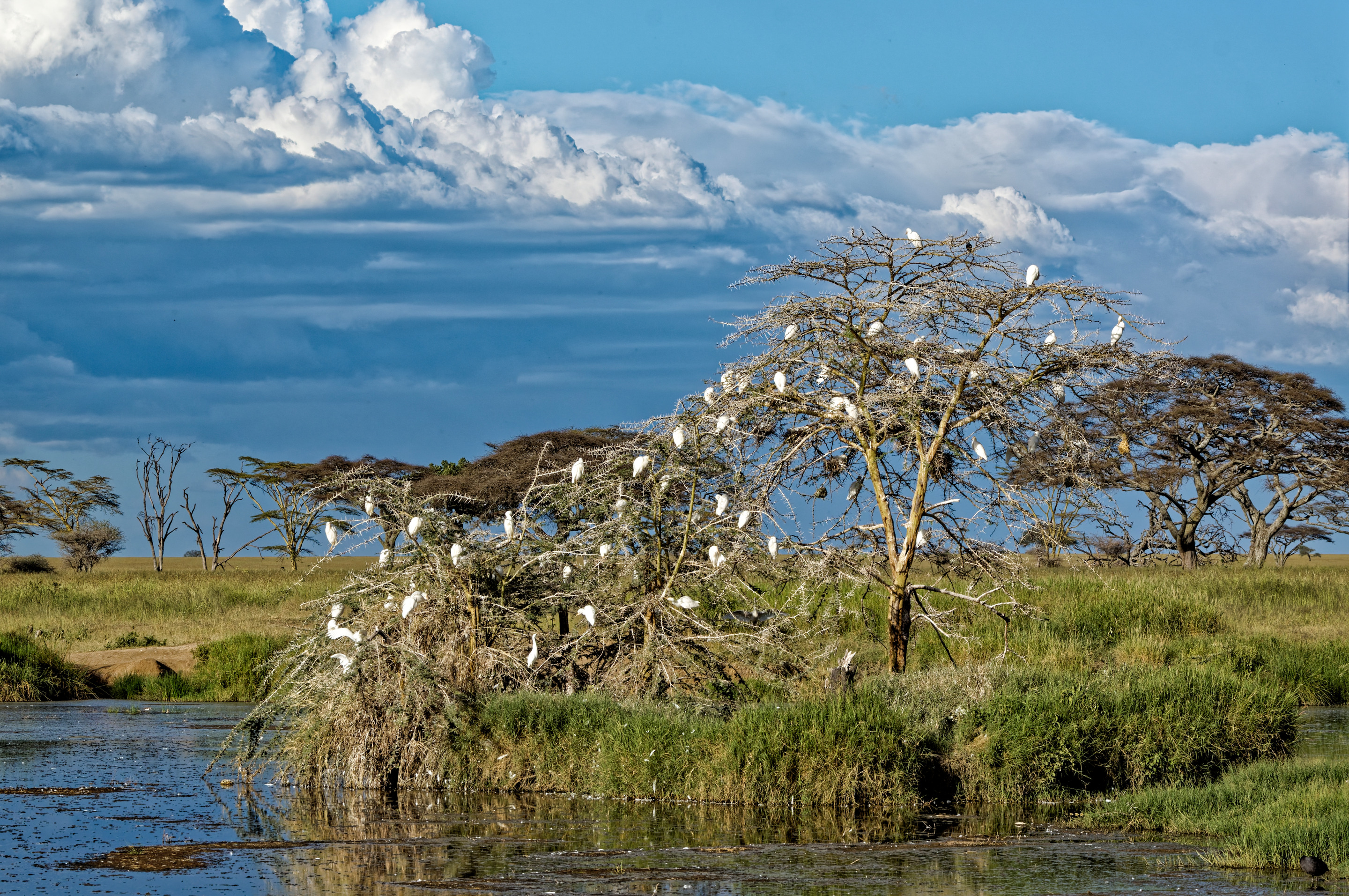 This scene captures a moment of serenity and wildness in the Serengeti. The egrets appear calm and undisturbed, perfectly blending into their natural environment.