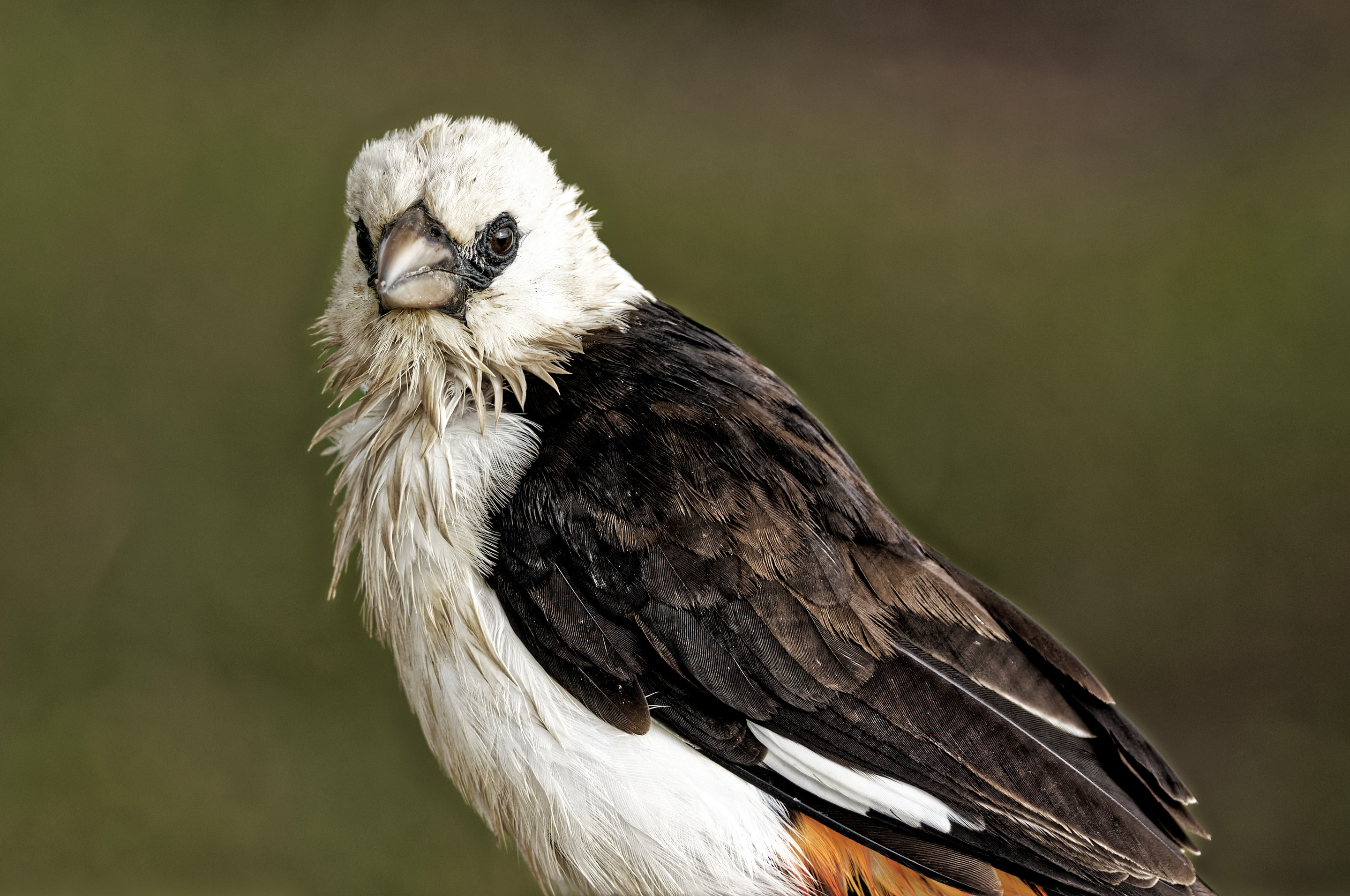A buffalo weaver perches alertly, its pale head contrasting with a bold dark patch around its eye. The bird's dark wings feature light markings, set against a soft green background that highlights its form. It's a striking image of this fascinating species.