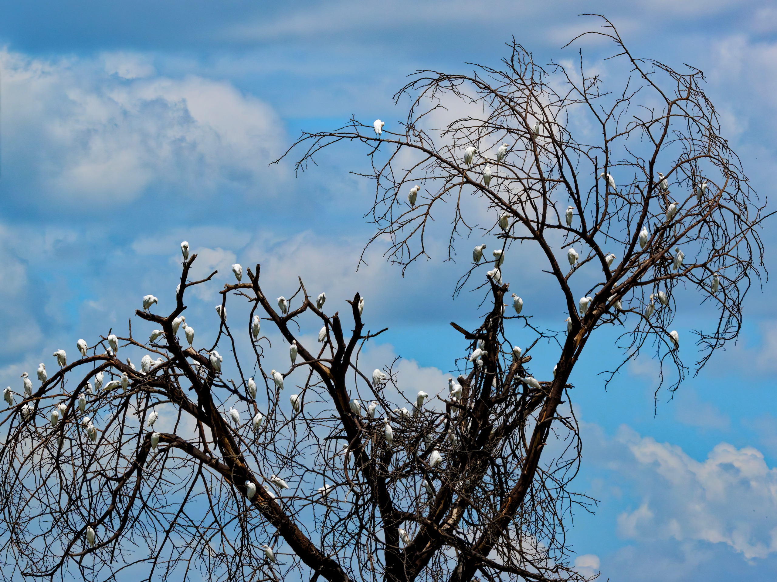 The birds rest quietly, attentively observing the surroundings from their elevated vantage point. Their pristine white feathers create a striking contrast against the dark, dry wood of the branches, offering them an expansive view to identify potential food sources and threats.