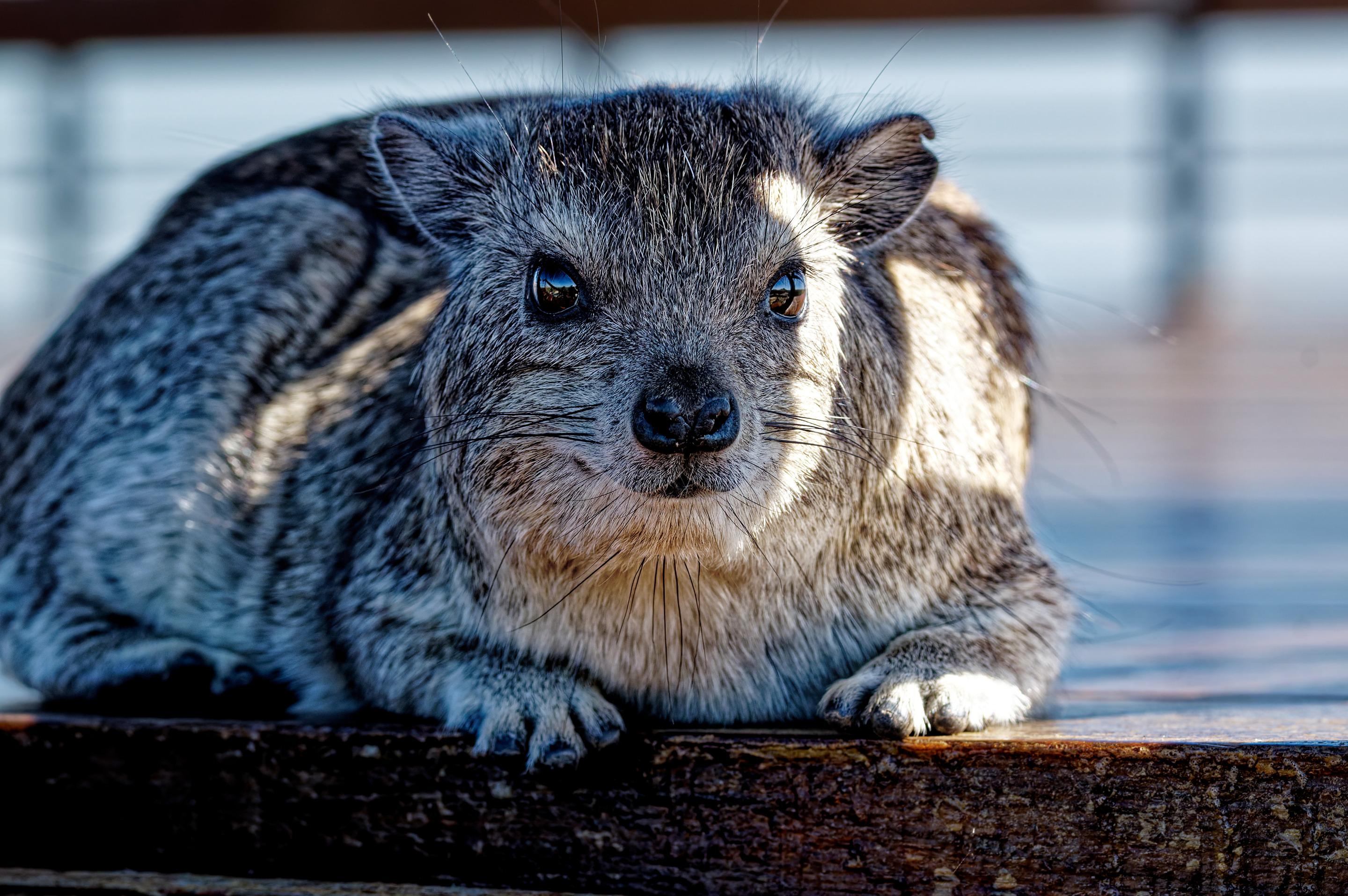 A rock hyrax rests comfortably on a weathered wooden surface. Its dense, gray-brown fur provides insulation from the sun, and its small, rounded ears twitch occasionally. The hyrax's dark eyes are alert, and its long whiskers seem to sense the surrounding environment.