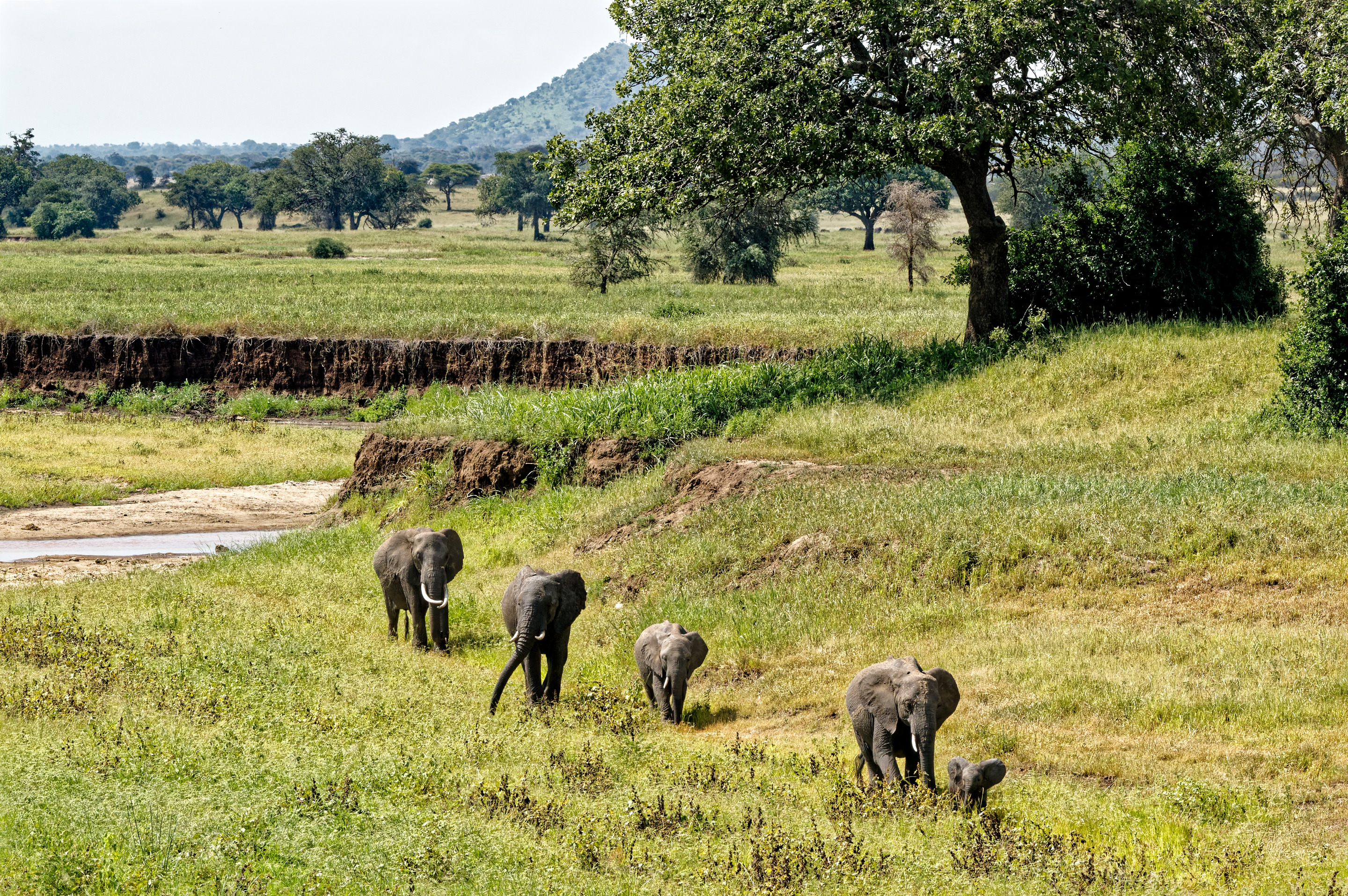 Animals and Vegetation in East Africa - TarangireTanzania 2012 - A small herd of African bush elephant walks along a grassy riverbank in open savanna, with a large tree at the right and a low hill in the distance. Several adult elephant move in a loose line, and a calf stays close to an adult for safety. They look calm and focused, using the trunk to smell and touch the ground as they travel. ?