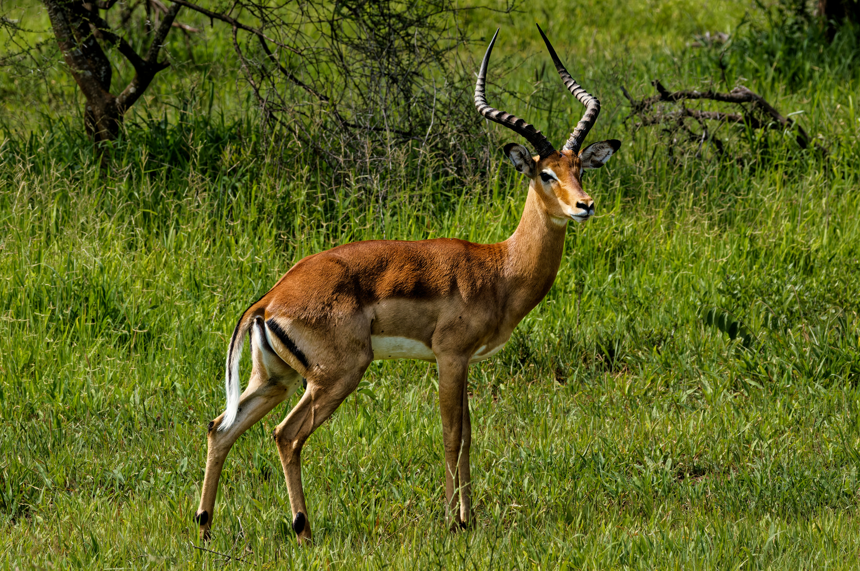 An impala stands in tall green grass near low bushes, looking alert with its head turned. It has a sleek reddish-brown coat with a pale belly, a dark stripe on the rear, and long ridged horns that curve upward.