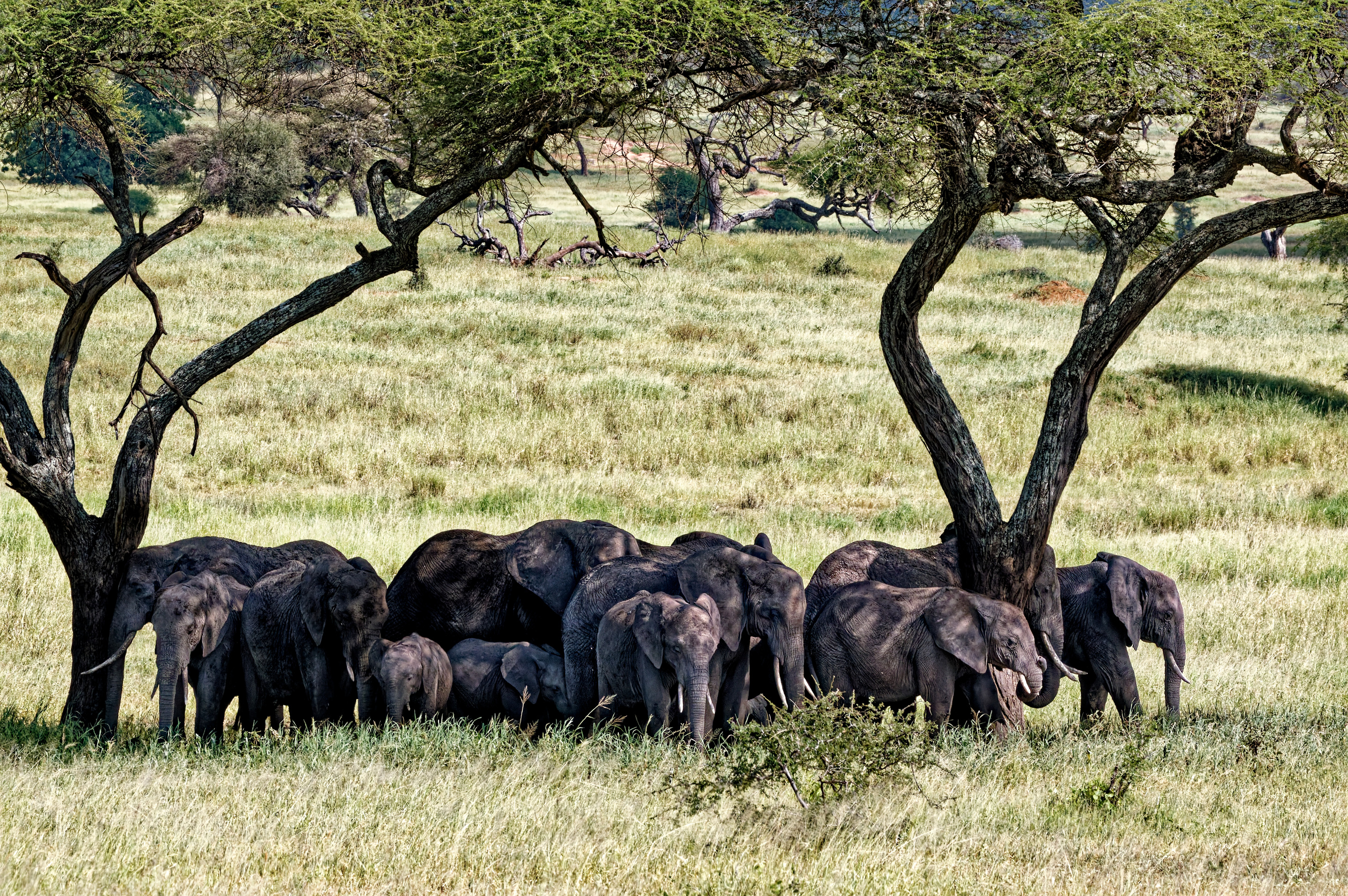A herd of African bush elephants gathers beneath the shade of a flat-topped acacia tree on a grassy savanna. The elephants appear calm and tightly packed, demonstrating a common behavior for safety and temperature regulation. A small calf is nestled within the group, seeking protection.