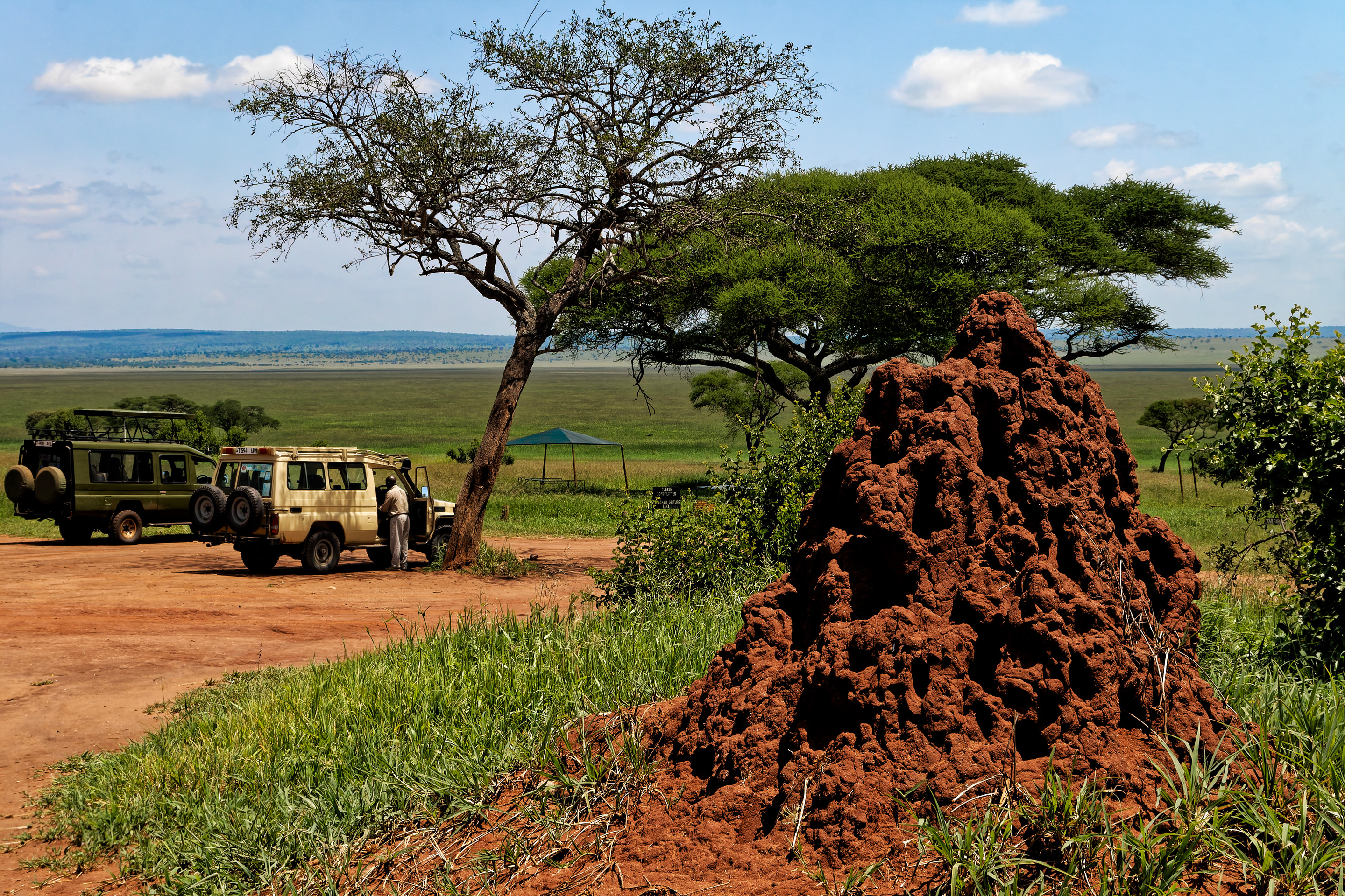 In the background, two safari vehicles are parked on a dusty track, facing the expansive savanna. The vehicles suggest a journey of exploration and wildlife viewing, a common activity in this region. The bright sky and open terrain create a feeling of warmth and sunshine.