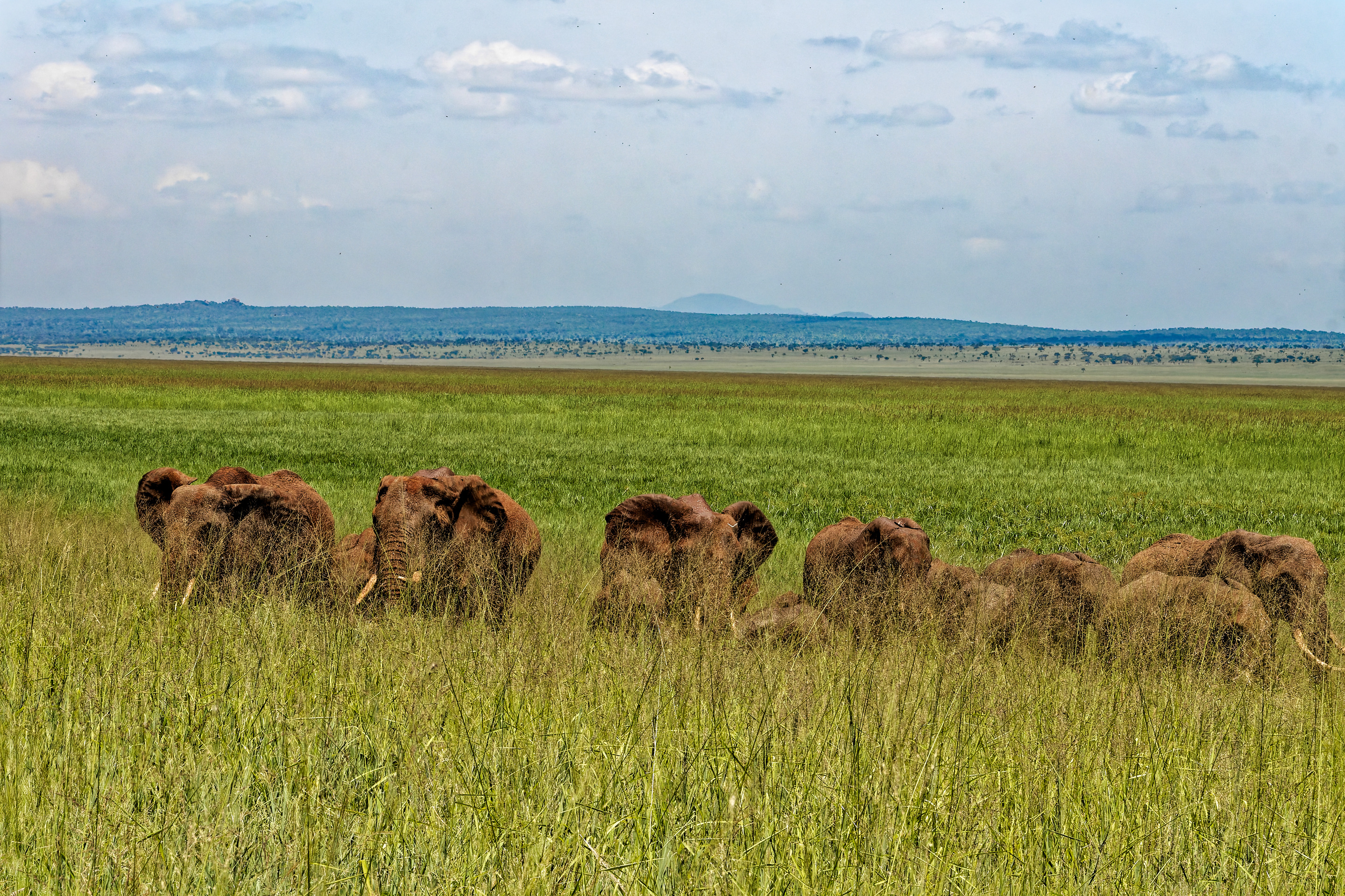 Animals and Vegetation in East Africa - TarangireTanzania 2012 - Herd of elephants - A herd of elephants gracefully traverses a vast, grassy savanna. The tall, green grass partially obscures their legs, creating a sense of depth and scale within the expansive scene. The distant horizon reveals gently rolling hills beneath a hazy blue sky, emphasizing the wide-open environment.