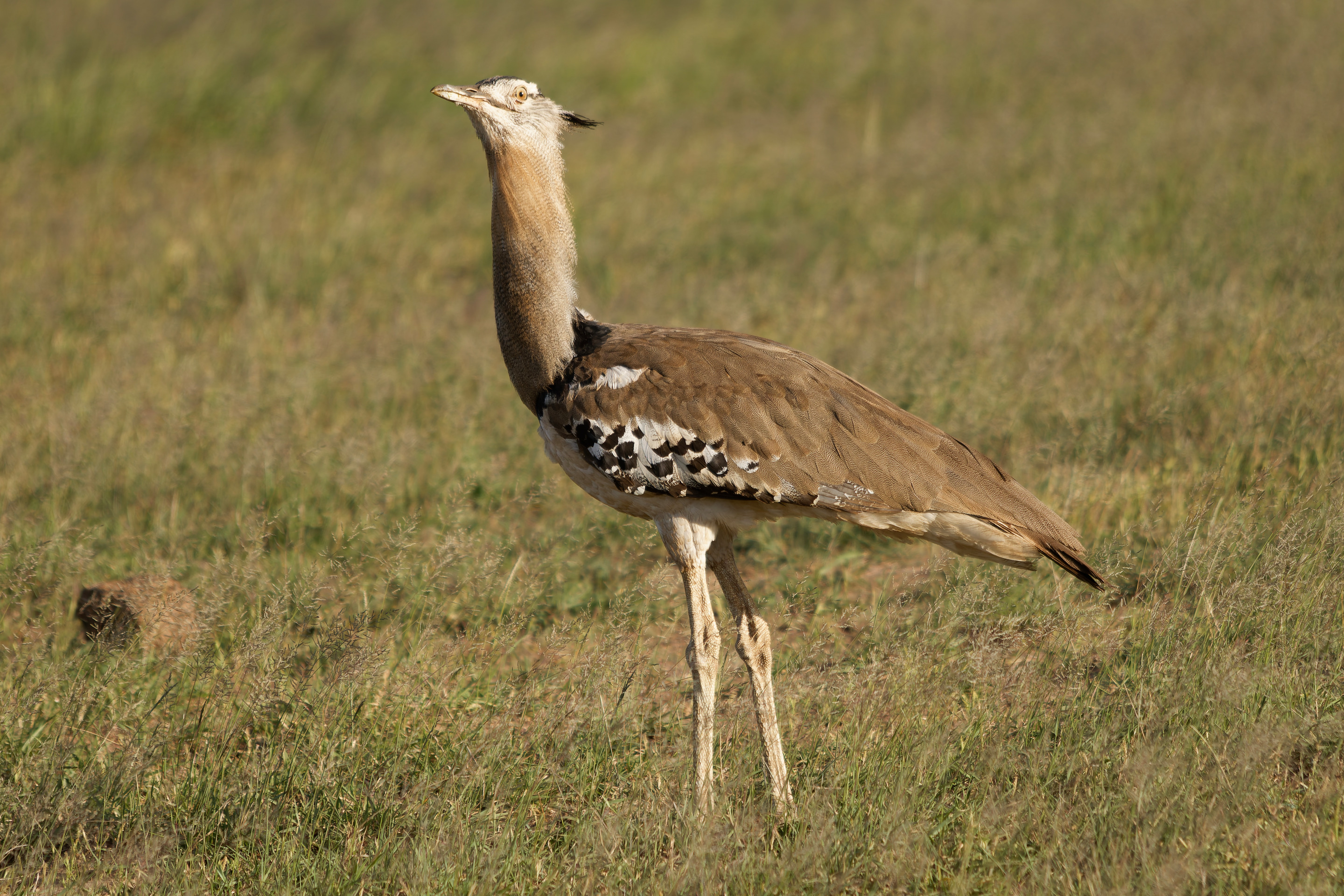 A bustard stands proudly in a short, dry grassland, its long neck and pale legs extending upwards. The bird's brown back is adorned with striking black-and-white spotted wing feathers, and its head is held high, suggesting alertness and vigilance as it scans the surrounding area.