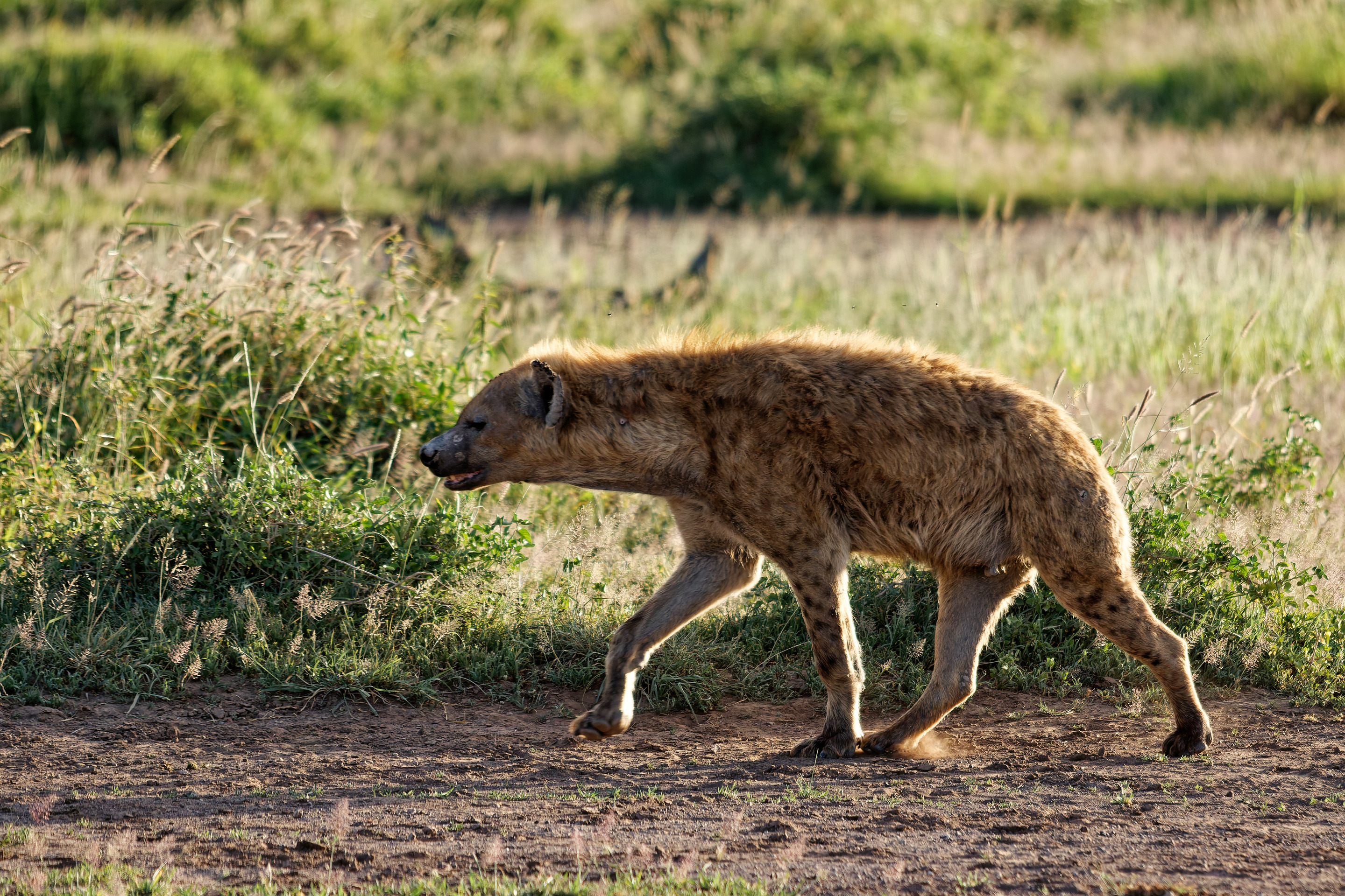 A spotted hyena walks along a dry dirt track in open savanna grassland. Low green bushes and short grass cover the flat ground in warm light. The scene conveys a sense of the African wilderness, showcasing the natural beauty and simplicity of the environment.