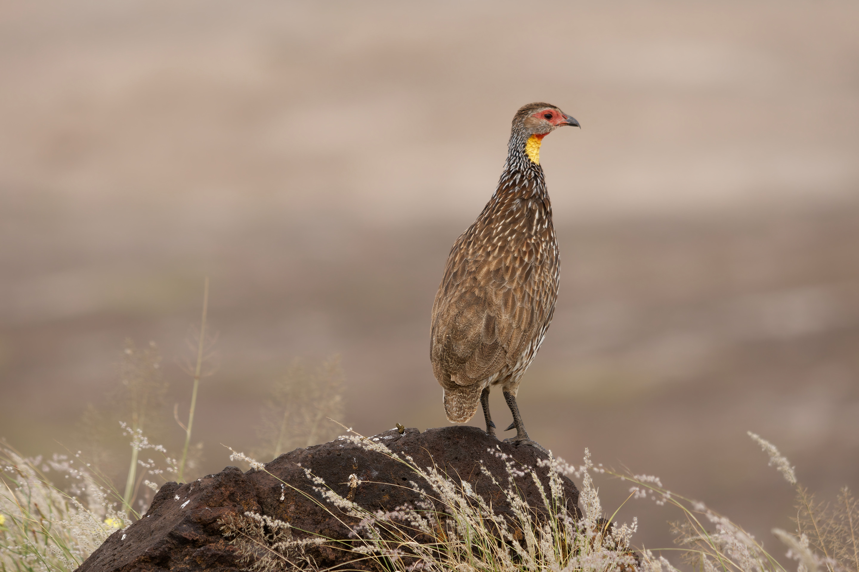 The bird looks alert as it scans the quiet open area. Francolins are ground-dwelling birds that feed mainly on seeds, shoots, and insects, and they often run for cover rather than fly when disturbed.