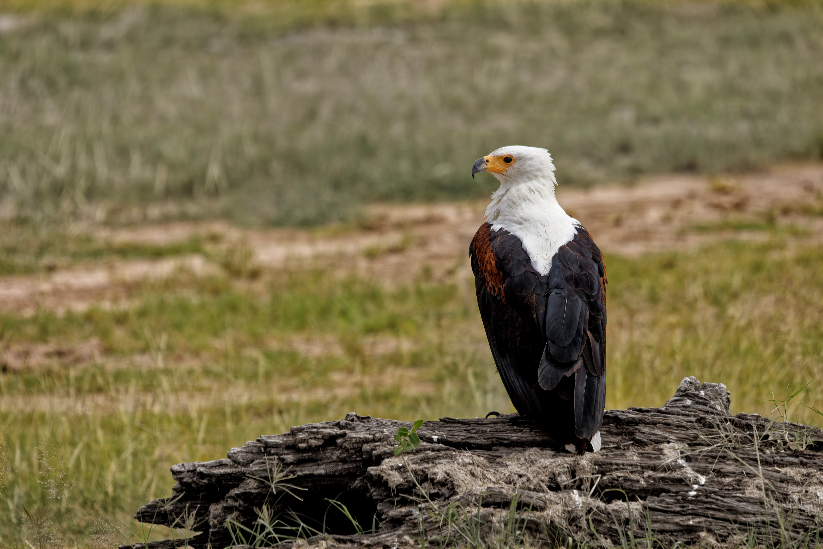 An African fish eagle stands upright on a dark, weathered tree stump in open grassland. It has a clean white head and chest, a strong yellow hooked beak, and deep brown wings.