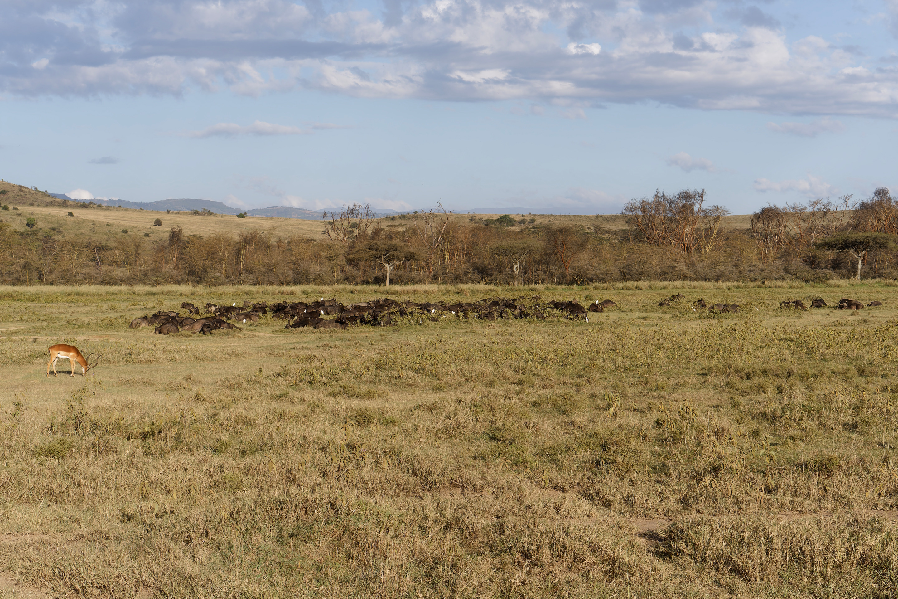 The buffalo, also known as Cape buffalo, are powerful bovines, known for their imposing horns and defensive behavior when threatened. They typically live in herds, foraging on grasses and other vegetation. Their presence is a vital part of the Lake Nakuru ecosystem, influencing vegetation patterns and serving as prey for predators like lions and leopards.